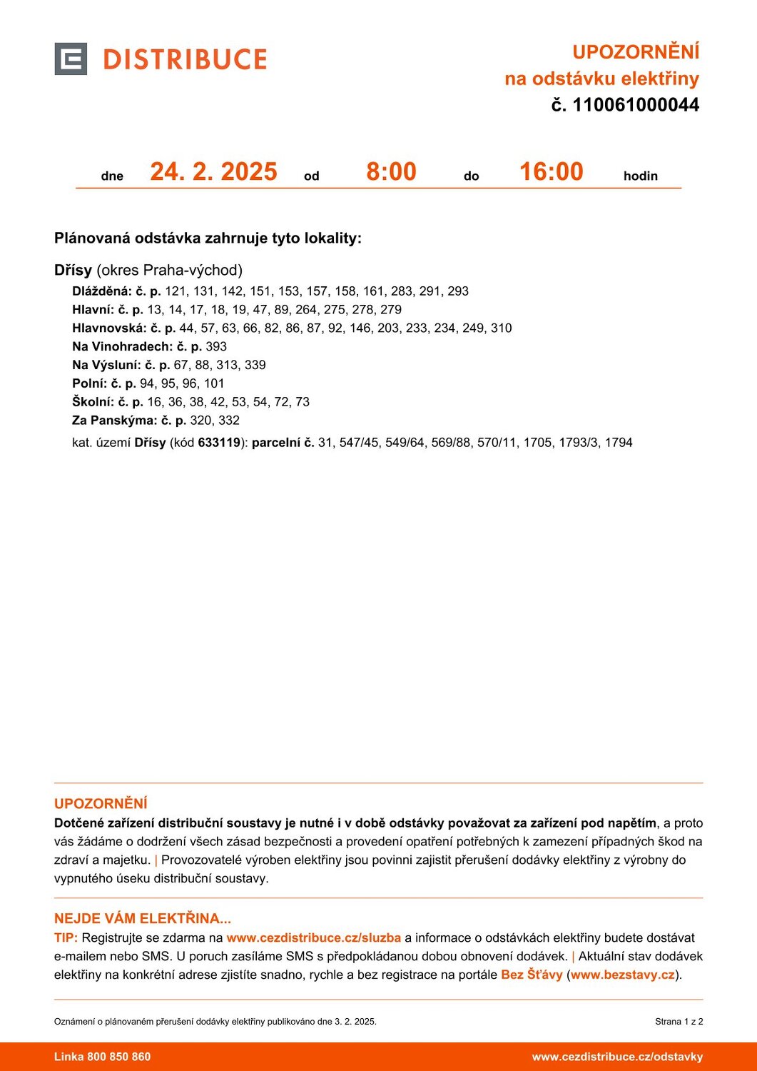 Oznámení o přerušení elektrické energie