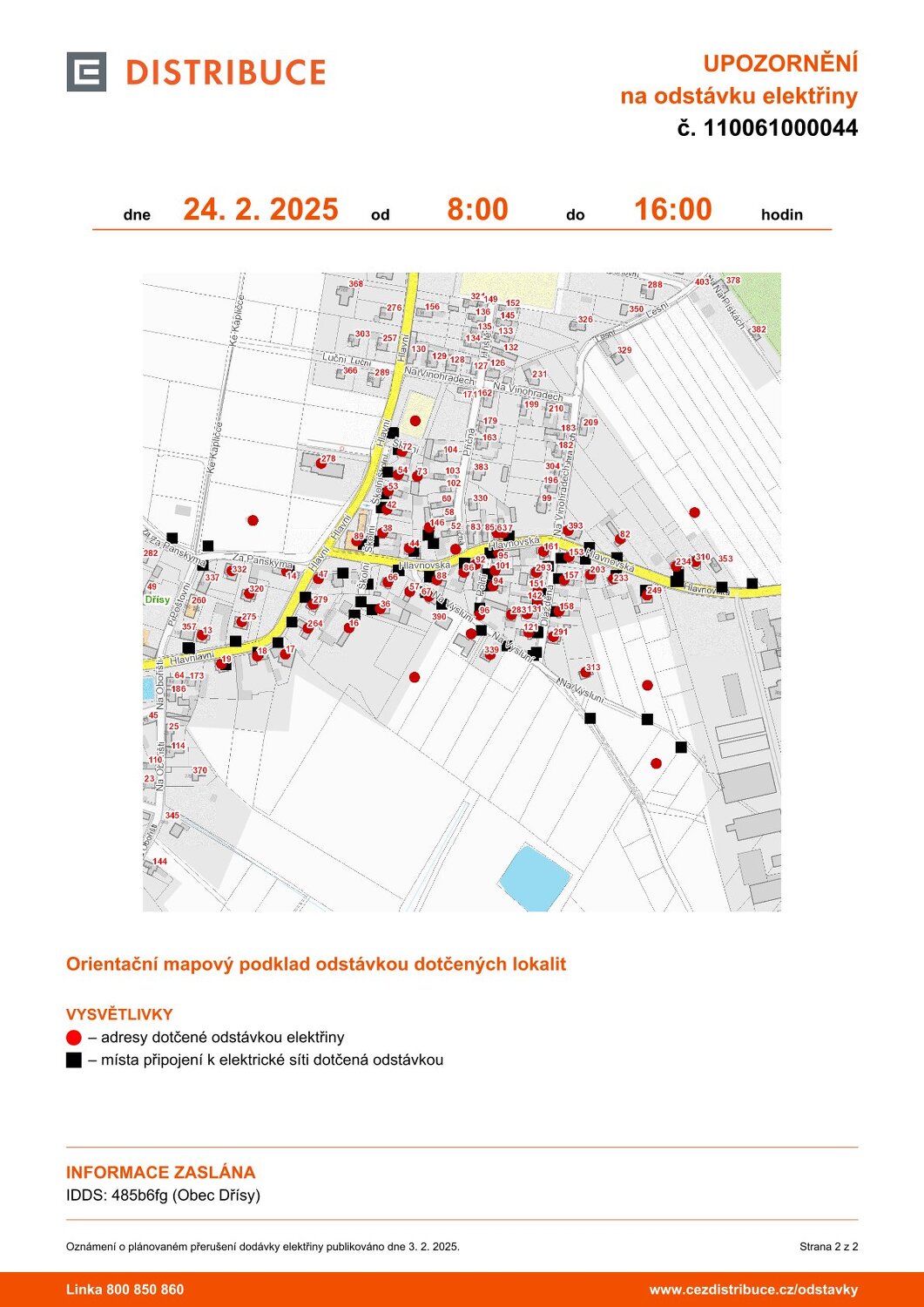 Přerušení dodávky elektrické energie v katastru naší obce je plánováno dne 24.2.2025 od 8 do 16 hodin. Plánek viz. níže.