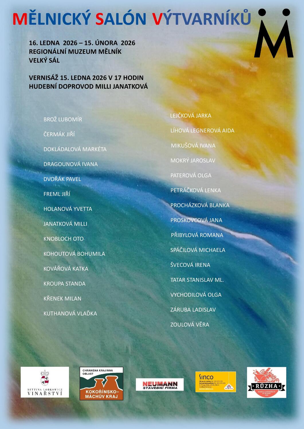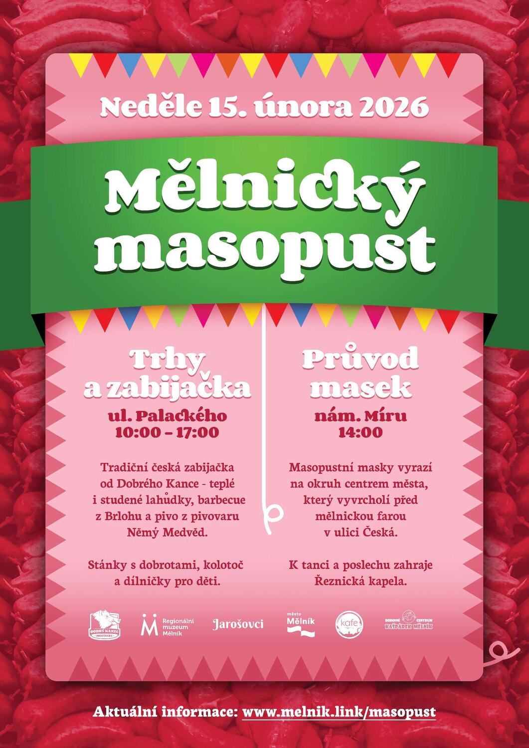 Kapacita je omezena. Rezervujte si své místo do 2.3. na emailu: kralova@muzeum-melnik.cz. Do 15. 2. na Vás ve velkém sále muzea čeká výstava Mělnický salón výtvarníků, která představuje tvorbu 27 autorů nejen z Mělníka a jeho okolí, ale i ze vzdálených míst naší republiky, Brna, Litomyšle a dalších. Zastavte se, přijďte se potěšit uměním a nechat se inspirovat. V neděli 15. 2. se muzejní maškary opět rádi připojí k masopustnímu veselí! Mělnický masopust začíná v 10:00 tradiční zabíjačkou u Dobrého Kance. Průvod pak vyráží v 14:00 z náměstí Míru. Připojte se k nám! Masky vítány. V pátek 27. 2. se koná další akce k výročí 50 let od vzniku CHKO Kokořínsko - Máchův kraj. V 19:00 můžete vyrazit za sovím houkáním do Kokořínského dolu. Pro více informací a další akce sledujte stránky Správy CHKO. Výstava výtvarných prací soukromé mělnické školy Eriza s názvem Eriza-art ve vstupních prostorech muzea byla prodloužena do 20. 2. 2026.