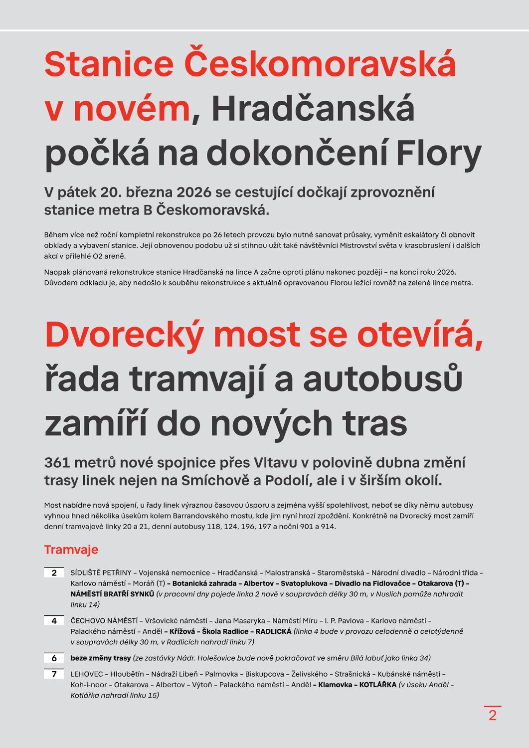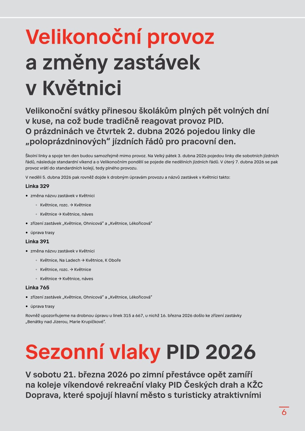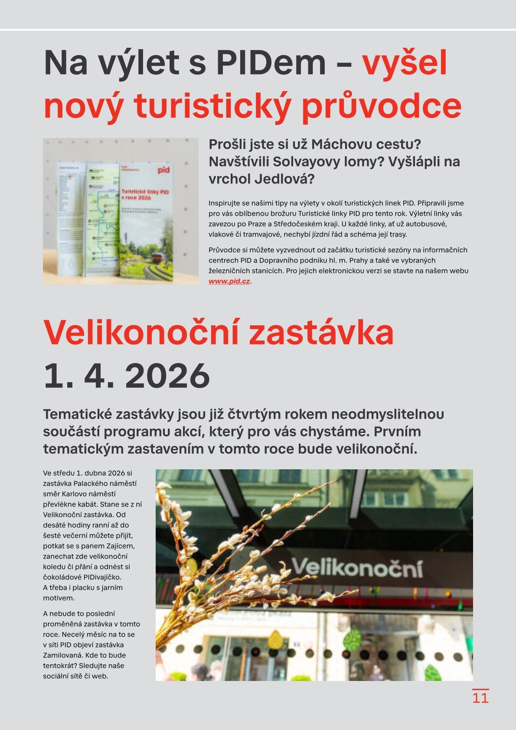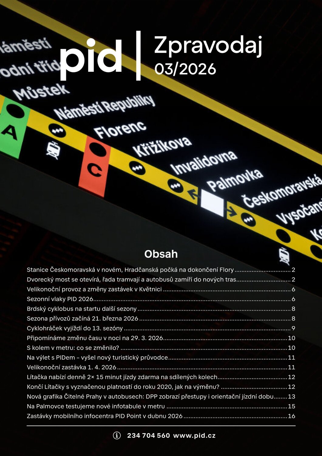 Stanice Českomoravská v novém, Hradčanská počká na dokončení Flory Dvorecký most se otevírá, řada tramvají a autobusů zamíří do nových tras Velikonoční provoz a změny zastávek v Květnici Sezonní vlaky PID 2026 Brdský cyklobus na startu další sezony Sezona přívozů začíná 21. března 2026 Cyklohráček vyjíždí do 13. sezóny Připomínáme změnu času v noci na 29. 3. 2026 S kolem v metru: co se změnilo? Na výlet s PIDem – vyšel nový turistický průvodce Velikonoční zastávka 1. 4. 2026 Lítačka nabízí denně 2× 15 minut jízdy zdarma na sdílených kolech Končí Lítačky s vyznačenou platností do roku 2020, jak na výměnu? Nová grafika Čitelné Prahy v autobusech: DPP zobrazí přestupy i orientační jízdní dobu Na Palmovce testujeme nové infotabule v metru Zastávky mobilního infocentra PID Point v březnu 2026 Pod tímto odkazem najdete Zpravodaj v plné velikosti: https://pid.cz/wp-content/uploads/ke-stazeni/zpravodaj/Info_PID_2026-03.pdf