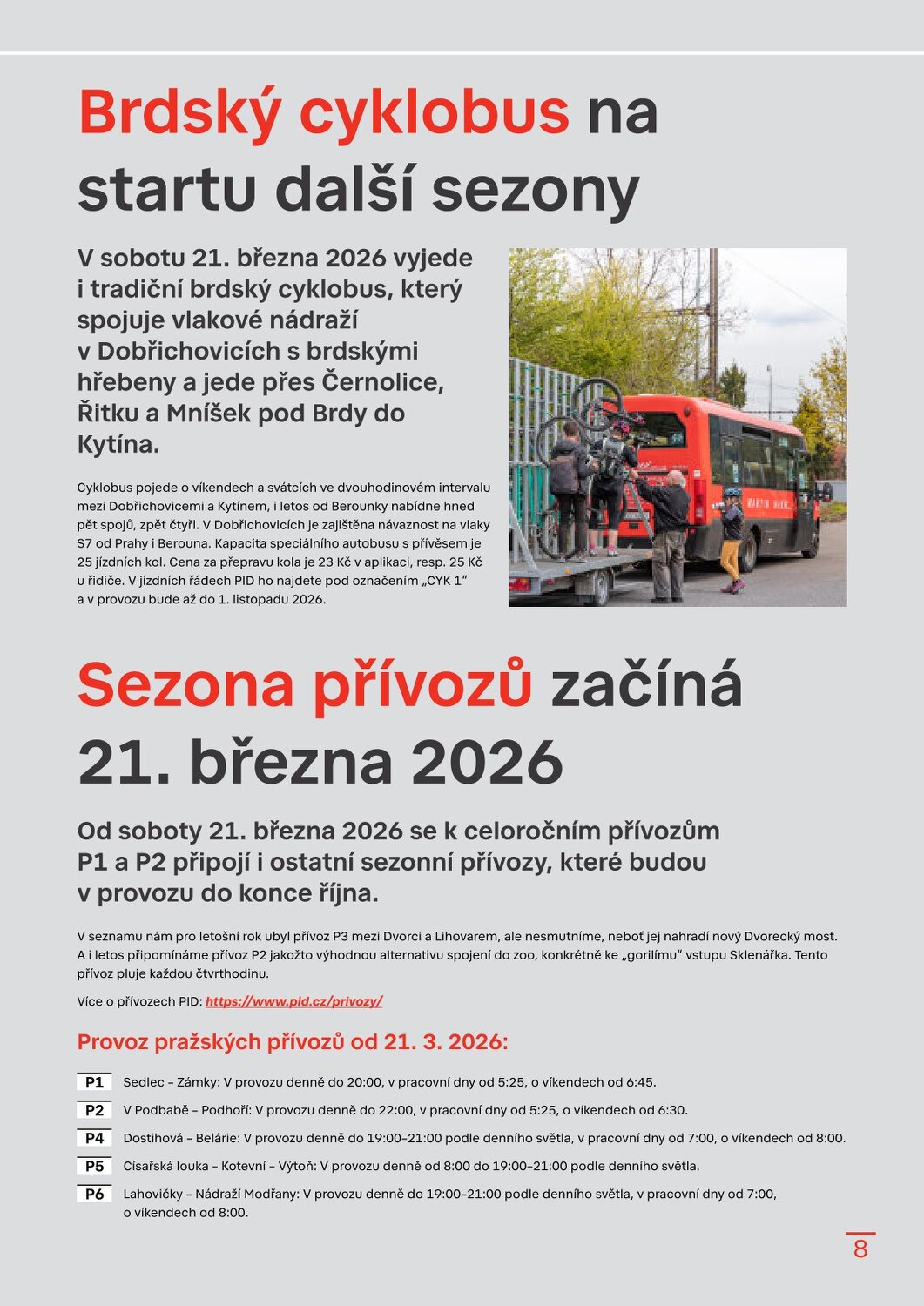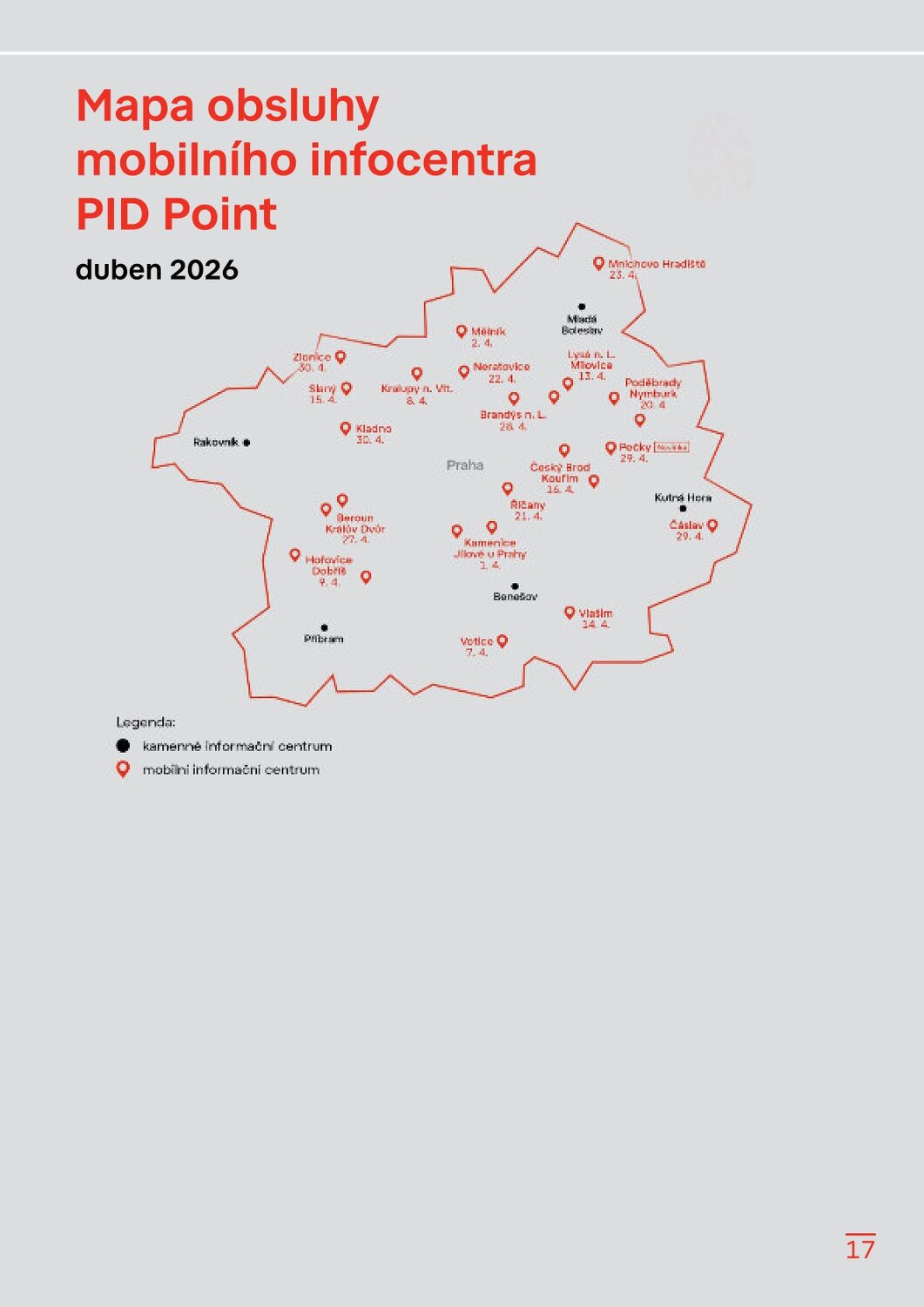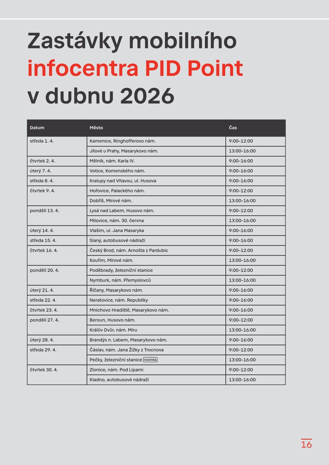 Stanice Českomoravská v novém, Hradčanská počká na dokončení Flory Dvorecký most se otevírá, řada tramvají a autobusů zamíří do nových tras Velikonoční provoz a změny zastávek v Květnici Sezonní vlaky PID 2026 Brdský cyklobus na startu další sezony Sezona přívozů začíná 21. března 2026 Cyklohráček vyjíždí do 13. sezóny Připomínáme změnu času v noci na 29. 3. 2026 S kolem v metru: co se změnilo? Na výlet s PIDem – vyšel nový turistický průvodce Velikonoční zastávka 1. 4. 2026 Lítačka nabízí denně 2× 15 minut jízdy zdarma na sdílených kolech Končí Lítačky s vyznačenou platností do roku 2020, jak na výměnu? Nová grafika Čitelné Prahy v autobusech: DPP zobrazí přestupy i orientační jízdní dobu Na Palmovce testujeme nové infotabule v metru Zastávky mobilního infocentra PID Point v březnu 2026 Pod tímto odkazem najdete Zpravodaj v plné velikosti: https://pid.cz/wp-content/uploads/ke-stazeni/zpravodaj/Info_PID_2026-03.pdf
